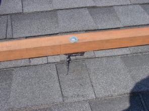 Install two parallel 2x3 redwood or treated lumber runners (see item # 1). Use ¼" lag bolts with a washer to fasten the runners to the roof. For a longer panel, install a third runner in the center to keep the panels from bowing. The wood runners must be installed with a slop to allow a complete drainage (the inlet point must be the lowest). The bolts should penetrate the roof rafters at 4' to 6' apart. "Sandwich" roofing compound at the bolt penetrations.