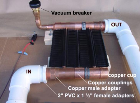 Solder the vacuum breaker, cup end the 1 ½" male copper adapter. Allow the copper to cool and use Teflon tape to connect the 2" x 1 ½" PVC female adapters to the copper adapter thread. Run the 2" PVC pipe to and from the panel with a slope to allow complete drainage.