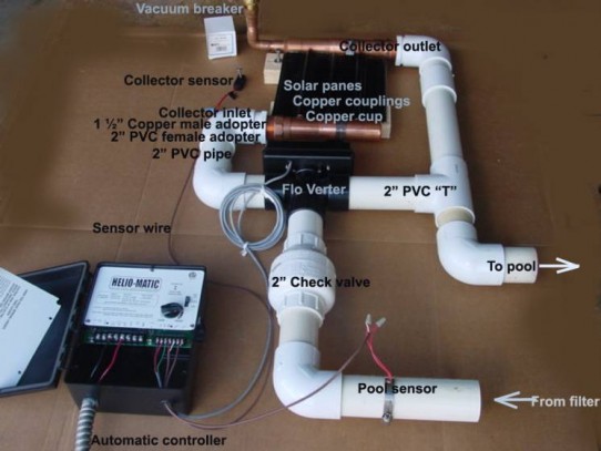 First you need to determine the direction of the flow. Look at the pump first; the pump is sucking the water from the pool through the skimmer and to the filter. Out from the filter to the heater and back into the pool. The solar system is added on to the section of the pipe after the filter and before the heater so filtered water will be flowing through the solar panels.