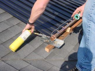 Clean the header with emery cloth as preparation for soldering. Flax and assemble the panels with 1 ½" copper couplings. Use wood blocks (same height as runners) to lift the assembled panel headers off the runners while soldering. Use a metal shield, wet rag and water squirt bottle while soldering to protect the roof from the torch flame and solder droppings.